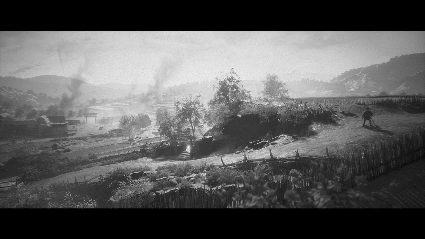 Inspired by classic Japanese cinema, Trek to Yomi is immaculately presented entirely in black-and-white. I love how each screen is beautifully composed, with the camera tracking Hiroki’s movements to reveal grand vistas. The cinematography is exquisite, with foreground and background elements thoughtfully placed to create a great sense of depth with every shot.